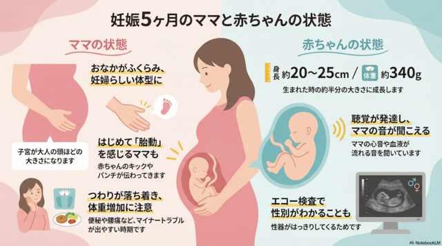 妊娠5ヶ月のママとおなかの赤ちゃんについてご紹介させていただきました。妊娠期間も半分にきて、胎動も感じるようになると、ママになる自覚も増えてきます。