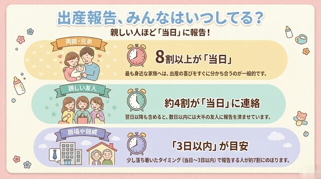 職場・仕事関係者には、ママの体調が落ち着いてからでも問題はありませんが、一般的には産後なるべく早めがいいとされています。