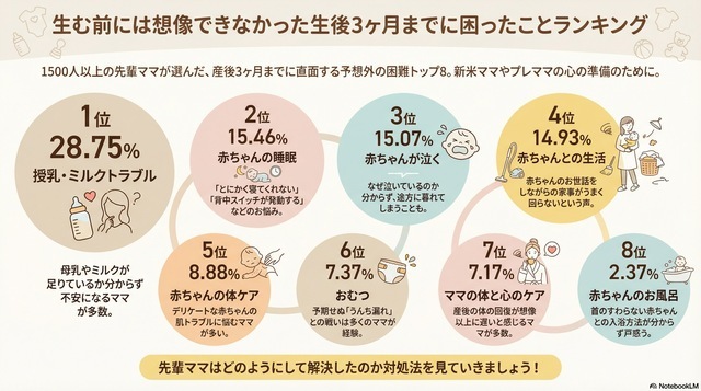 1500名以上の出産を経験したママに「生後3ヶ月までの間に生む前には想像つかなかったこと」を聞いてみました。28%以上の回答を集めたのが「授乳・ミルクトラブル」でした。