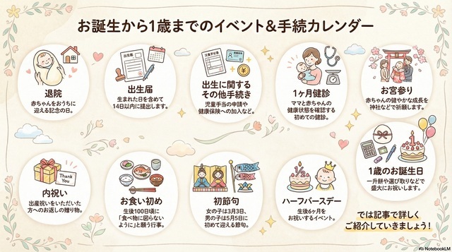 赤ちゃんのお誕生から1歳までの手続きやイベントをお伝えしました。