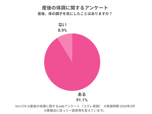 まずは、「産後に体調の変化を感じたことがある」という質問に対しては、なんと91.1%のママが「ある」と回答。