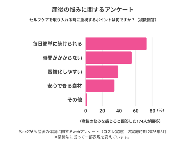 忙しいママのセルフケアでは、毎日無理なく続けられる方法を取り入れることが大切。アンケートでも、毎日簡単に続けられるケア方法を72.9%のママが希望しています。